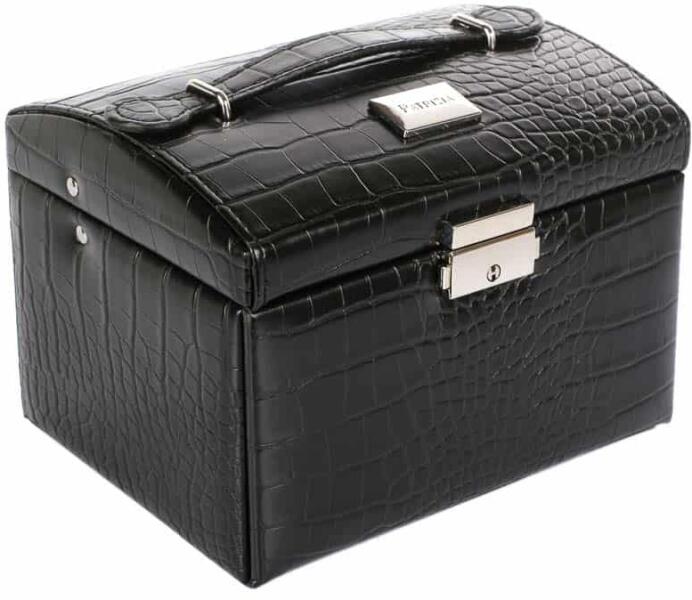 Tárolja rendezetten ékszereit a Patrizia Beauty exkluzív ékszerdobozában. A különleges fekete műbőr borítású doboz külső mérete: 17 cm x 14 cm x 13 cm. Felül hordozófül található. Ezüst színű csatja kulccsal zárható. A doboz belső része nagyon praktikus, számos rekesz és egy tükör is található benne. A lánccal kihúzható rekesz összecipzározható, és így egy kis méretű mobil tartónk lesz, amit könnyen magunkkal vihetünk a kézitáskánkban.