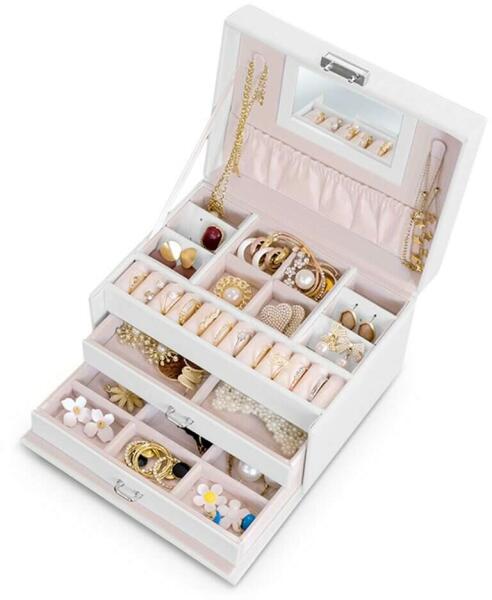 Elegáns Ékszerdoboz: Tökéletes Ékszereid Tárolására ✨ Ez a gyönyörű, fehér ékszerdoboz tökéletes helyet biztosít értékes ékszereid számára. Praktikus kialakításának köszönhetően minden darabodnak megtalálod a helyét, és biztonságban tudhatod őket. ? Kényelmes és Funkcionális: ? Kulccsal zárható, így megakadályozza a véletlen nyitást. ? Praktikus hordozófogantyú a könnyű szállításért. ? Beépített tükör a kényelmes sminkeléshez. Stílusos és Elegáns: Modern, elegáns forma, amely tökéletesen illeszkedik bármely hálószobába. Kifinomult részletek és gyönyörű fehér szín. Ideális ajándék minden nőnek, kortól függetlenül. Prémium Minőség: Strapabíró, kopásálló PU anyagból és ökobőrből készült. Aprólékos kidolgozás, tartós és hosszú élettartam. Tágas és Jól Szervezett: Bőséges hely a nyakláncok, gyűrűk, fülbevalók és egyéb ékszerek számára. Külön rekeszek és fiókok a praktikus tárolásért. Méretek:Méret Méret (cm)Hosszúság 18,6Szélesség 14,8Magasság 11Ez az ékszerdoboz nem csak praktikus, de gyönyörű is, és minden nő álma lehet! ?