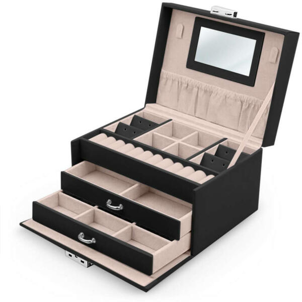 Elegáns, tágas ékszerdoboz fekete színben: Tökéletes ékszereid biztonságos tárolására ? Ez a stílusos és praktikus ékszerdoboz ideális megoldás minden ékszerkedvelő nő számára. A robosztus, kopásálló PU ökológiai bőrből készült doboz elegáns fekete színben pompázik, és tökéletesen védi értékes ékszereidet a karcolásoktól és a sérülésektől. A beépített tükör segítségével könnyedén ellenőrizheted megjelenésed, míg a különböző rekeszek és fiókok gondoskodnak az ékszereid rendezett tárolásáról. Főbb jellemzők: ? Kulccsal zárható: Megakadályozza a véletlen kinyílást és biztosítja ékszereid biztonságát. ? Beépített tükör: Kényelmes sminkeléshez és ékszerválasztáshoz. ? Nyakláncfogók: Megakadályozza a nyakláncok összegabalyodását. ?️ Praktikus rekeszek és fiókok: Rengeteg hely a gyűrűk, fülbevalók, karkötők és nyakláncok számára. ? Méret: 18,6 cm x 14,8 cm x 11 cm - tökéletes méret a hordozhatósághoz és a tároláshoz. ? Hordozófogantyú: Könnyű szállításra. ?️ Prémium minőségű PU ökológiai bőr: Tartós és elegáns anyag. Kinek ajánljuk? Ez az ékszerdoboz minden korosztály számára tökéletes választás, legyen szó egy kislány első ékszereiről vagy egy felnőtt nő értékes gyűjteményéről. A tágas kialakításnak köszönhetően minden ékszerednek elegendő helyet biztosít, miközben stílusos megjelenése feldobja hálószobád vagy fürdőszobád. Rendezd el ékszereidet stílusosan és biztonságosan ezzel a prémium minőségű ékszerdobozal! ✨
