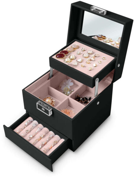Elegáns Ékszerdoboz: Tökéletes Ékszereid Tárolására ✨ Ez a stílusos és praktikus ékszerdoboz tökéletes helyet biztosít értékes ékszereid számára. Több rekeszének és fiókjának köszönhetően minden darabodnak megtalálod a helyét, rendben és biztonságban tarthatod őket. A beépített tükör pedig segít a tökéletes smink elkészítésében. Főbb jellemzők: ? Több rekesz és fiók: Fülbevalóknak, gyűrűknek, nyakláncoknak és karkötőknek külön rekeszek ? Kulccsal zárható: Véletlen kinyitás elleni védelem ? Beépített tükör: Kényelmes sminkeléshez ? Hordozható fogantyú: Könnyű szállítás ? Méret: 13 cm x 13 cm x 12,5 cm ? Prémium minőségű PU ökológiai bőr: Tartós és elegáns anyag Miért ezt az ékszerdobozt válaszd?Tökéletes szervezés: Minden ékszerednek megtalálod a helyét, így mindig kéznél lesznek, amikor szükséged van rájuk. Elegáns megjelenés: Stílusos fekete dizájn, amely bármilyen hálószobába illeszkedik. Biztonságos tárolás: A kulccsal zárható mechanizmus megvédi ékszereidet a sérülésektől és a lopástól. Praktikus és kényelmes: A hordozható fogantyúnak köszönhetően könnyen magaddal viheted bárhová. Rendezd el ékszereidet stílusosan és biztonságosan ezzel a gyönyörű ékszerdobozal! ?