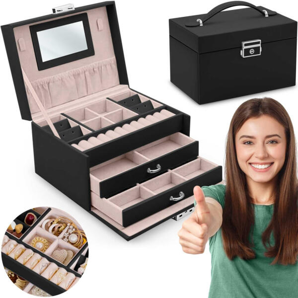 ékszerdoboz Kényelmes és funkcionális: zárva, fény, Handy (könnyű tárolás) Kezelő fogantyú, Blokkolja a funkciót a véletlen megnyitás előtt. Elegáns: Gyönyörű szín és modern forma, Tökéletes mind felnőtt nő, mind tinédzser számára, Óvatosan kész. Prémium minőség: szilárd anyagokból készül, nagy szilárdságú, kopásálló, PU anyag ökológiai bőr, minden részletben finomítva. Rendkívül tágas, gyönyörű és stílusos! Magasan besorolt Ez a doboz kielégíti a lányos álmokat és a női igényeket. Elég hágó ahhoz, hogy a lány első kincseinek mellkasává váljon, és ugyanakkor elegáns, mint egy nő ékszergyűjteménye egy felnőtt nőből. Stílus és végrehajtás, amely túlmutat az ilyen típusú termékek színvonalán, amelyek a lengyel piacon rendelkezésre állnak. Ékszer -doboznk különféle ízlésbe kerül, és minden hölgy számára hasznos lesz, anélkül, hogy megkérdezi tőle az életkorát. A tágas Ékszerdoboz meghatározása: Handy méret: 18,6 cm x 14,8 cm x 11 cm bezárva egy kulcsmal (megakadályozva a véletlenszerű nyílást) tükör fogas a nyakláncokhoz nagy zseb Gyakorlati rekeszek A fülbevalók helye Hely a gyűrűkhöz Nagy szilárdságú, kopásálló, PU anyag ökológiai bőr Fiókok rekeszekkel