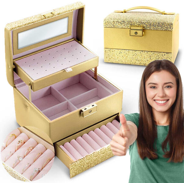 ékszerdoboz Kényelmes és funkcionális: zárva, fény, Handy (könnyű tárolás), Kezelő fogantyú, Blokkolja a funkciót a véletlen megnyitás előtt. Elegáns: Gyönyörű szín és modern forma, Tökéletes mind felnőtt nő, mind tinédzser számára, Óvatosan kész. Prémium minőség: szilárd anyagokból készül, Erős kastélyok, nagy szilárdságú, kopásálló anyag, minden részletben finomítva. Rendkívül tágas, gyönyörű és stílusos! Magasan besorolt Ez a doboz kielégíti a lányos álmokat és a női igényeket. Elég hágó ahhoz, hogy a lány első kincseinek mellkasává váljon, és ugyanakkor elegáns, mint egy nő ékszergyűjteménye egy felnőtt nőből. Stílus és végrehajtás, amely túlmutat az ilyen típusú termékek színvonalán, amelyek a lengyel piacon rendelkezésre állnak. Ékszer -doboznk különféle ízlésbe kerül, és minden hölgy számára hasznos lesz, anélkül, hogy megkérdezi tőle az életkorát. A tágas Ékszerdoboz meghatározása: Handy méret: 17,5 cm x 13,7 cm x 12,5 cm bezárva egy kulcsgal (megakadályozva a véletlenszerű nyílást), tükör, A fülbevalók helye, Gyakorlati rekeszek (egy kamrába történő kibővítés lehetősége), Hely a gyűrűkhöz.