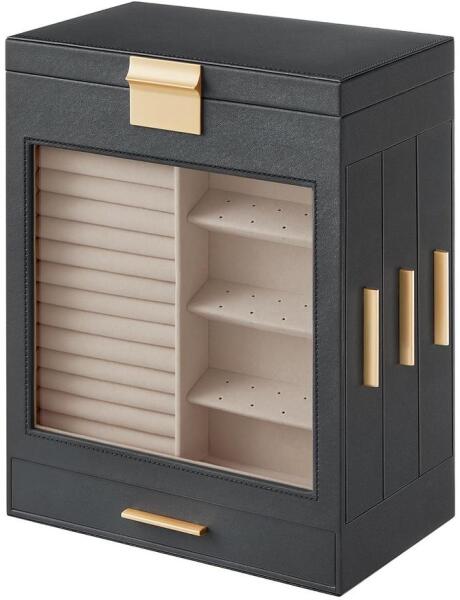 • [Cserélhető oldalfiókok] A 3 oldalsó fiók helyzete változtatható, hogy tetszés szerint különböző ékszereket állíthasson elő. Értékeit pedig pormentesen tartja ennek az ékszerdoboznak az átlátszó üvegablaka mögött!