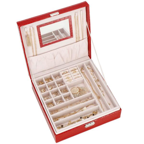 Ékszeres doboz HA1027Alapvető jellemzők:Márka anyag: öko bőr + velúr + MDFtok színe: piros + dekoratív kivitelbelső szín: világos rózsaszínszarvasbőr belsőzár típusa: kulcsBelső tok:12x kis rekeszek: 3 x 3 cm3x rekesz: 17,5 x 2,5 cm2x rekesz: 23,5 x 2,5 cm1x rekesz: 6,5 x 6,5 cm2x gyűrűs rekesz: 6,5 x 3,5 cmtükör: 11 x 8 cm4x akasztókampó1x szövetzseb: 25 x 9,5 cm2. szint: 9x rekesz: 8,5 x 8,5 cmMéretek:szélesség: 26 cmmagasság: 8,5 cmmélység: 26 cm