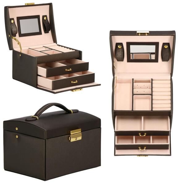 Címke: springosAnyag: Springos, Sprosos, Sprosos, Sprosos: MDF + öko bőr + velúrSzín: sötétbarna árnyalat, aranyszínű elemekkelFelület: gyöngyházBélés színe: púderrózsaszínFiókok száma: 2Felső rekeszek száma: 4Tükör: igenZáródási típus: dupla retesz kulccsalHordozó fogantyúDoboz méretei: 1 db:méret: 17,5 x 14 x 12,5 cmTükör méretei:7 x 4,5 cm1. fiók:16 x 11,5 x 2,5 cmkét rekesz: 8 x 11,5 cm2. fiók:16 x 11,5 x 2,5 cm6 rekesz: 5 x 5 cm, kivehető elválasztókkalFelső gyűrűs rekesz:11,5 x 5 cm7 sorFelső rekesz elválasztókkal:5 x 5 cm2 lyukas fülbevalóbetétFelső rekeszek elválasztók nélkül:5 x 5 cm11,5 x 5 cm2 pánt csatos rögzítéssel:6 x 2 cmegyenként 3 pár fülbevaló számáraFogantyú:17 x 2 cmtűrés +/- 5%